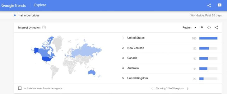 Mail order brides are known worldwide, but it’s clear that the interest in mail order marriages is particularly apparent in the Western part of the planet. If we look at the Google Trends map of countries where mail order bride-related searches are the most common, we will see that the US, Canada, Australia, and the UK & Ireland are the countries with the biggest demand for mail order bride services.