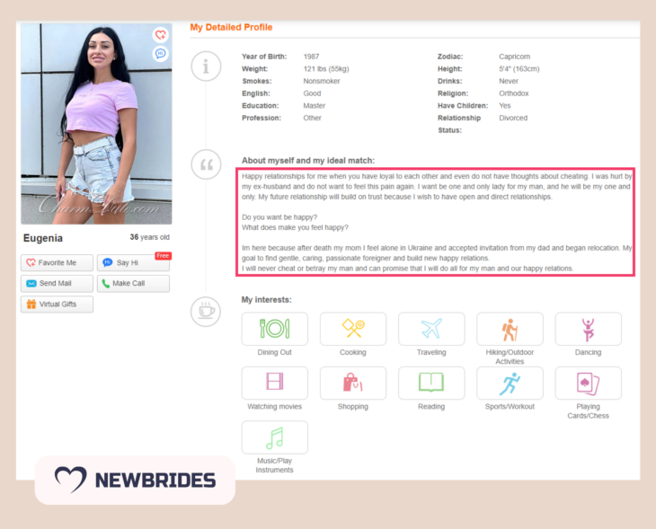 Now that you know how to create a proper online dating profile, let’s take a look at profiles of women on the CharmDate dating site. We have found out that there are a lot of detailed and highly professional profile pages on the site. It means that the platform encourages girls to be descriptive, honest, and open, which is great.